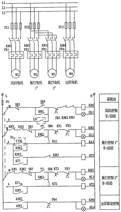 KM2、KM3可选用接入皮带机控制回路,作振打时联动停止皮带机组。